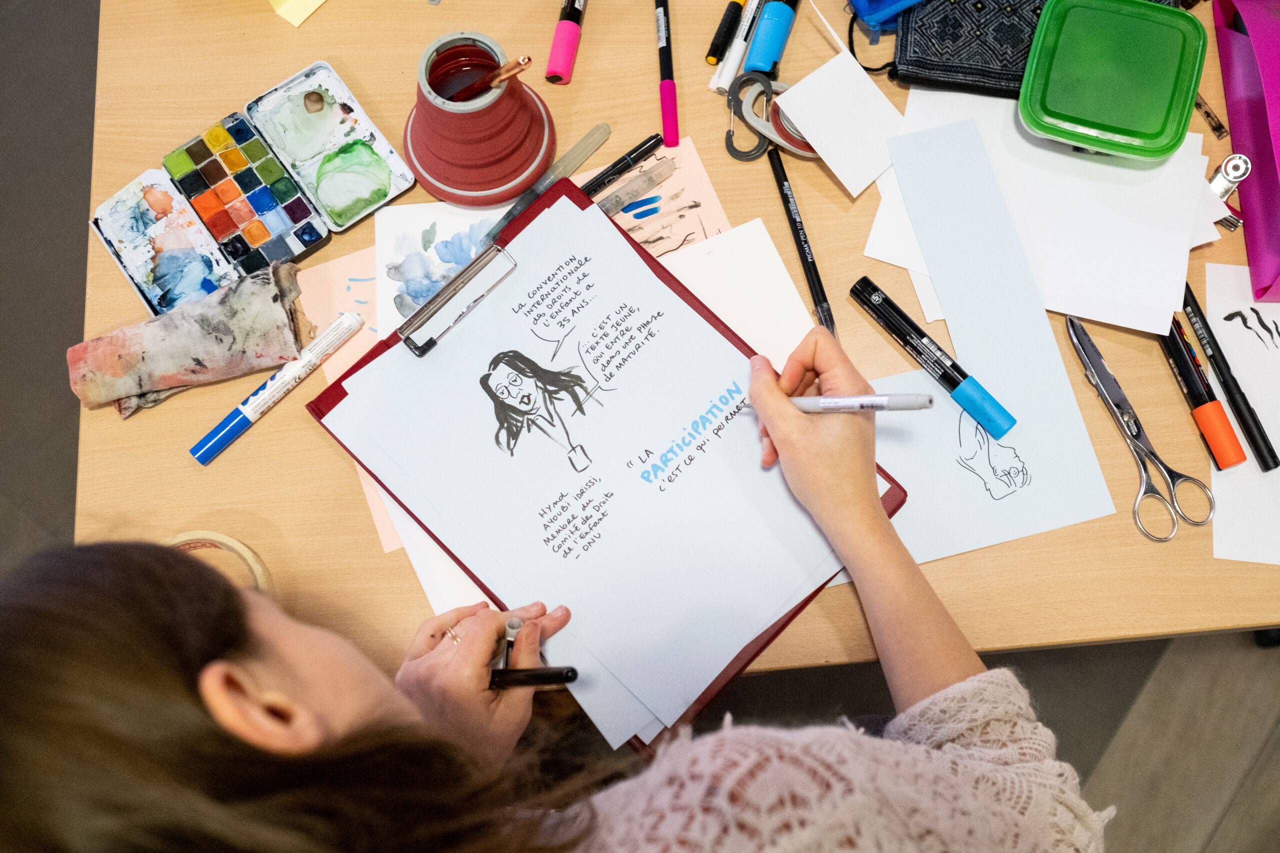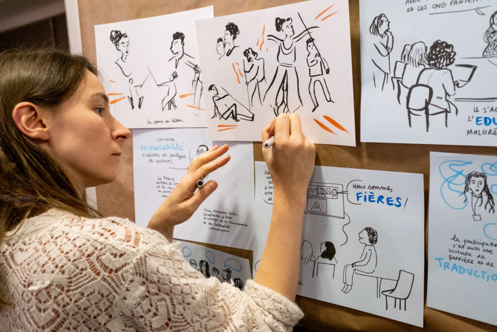 Le Groupe Enfance a été accompagné tout au long de l’événement par Anna Lentzner, facilitatrice graphique, qui a permis de retranscrire les différents échanges de la journée sous un format dessiné.