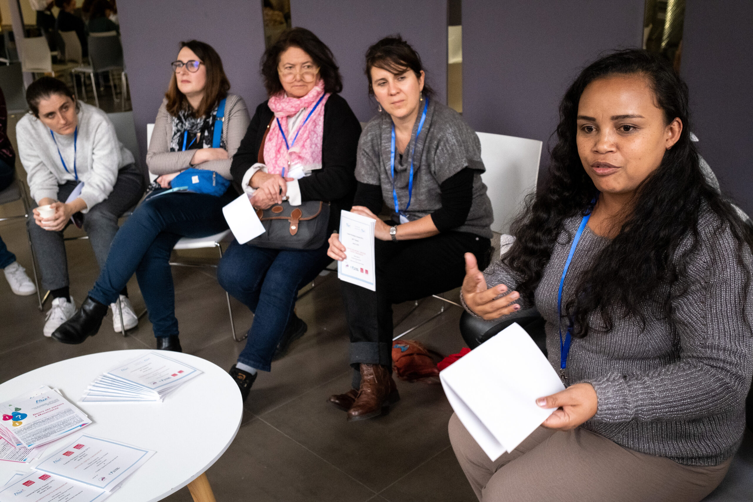 De gauche à droite : Kermina et Pola accompagnés de leur traducteur ; Thani Mohamed-Soihili ; Hynd Ayoubi Idrissi ; Kaningbè ; Véronique ; Vanessa Martin